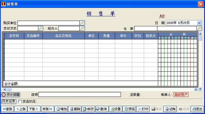 销售管理包含: 销售开票、 销售退货换货管理、 分期收款管理、 销售汇总统计、收款统计、 应收帐款统计、按任意时间段进行销售统计汇总、客户价格跟踪:开单时,可以调出历史销售价格、可以当即查看当前库存量。可以进行客户交易提醒,软件操作简单,可以直接输入拼音简称调出客户和商品,无须记忆。支持条形码管理,支持扫描枪。一键完成制单、记帐及新增单据。可任意设置打印格式。