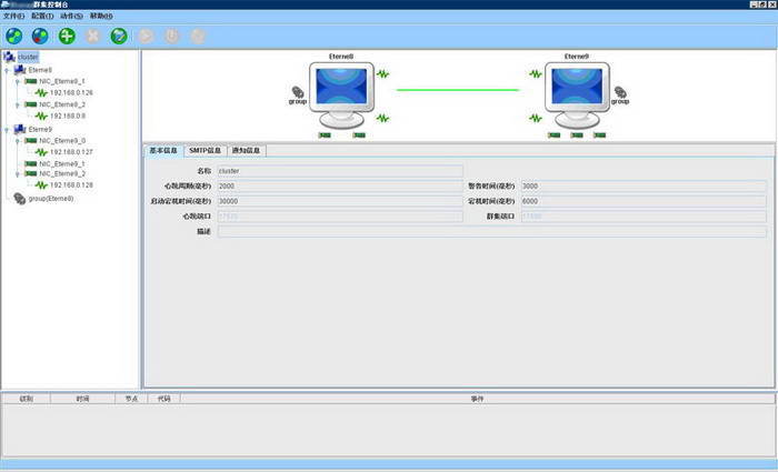 EterneCluster-MN软件通过多台服务器间心跳连线感知对方的工作状态,及时有效的了解服务器现实状况并能将故障机的工作以最快的速度切换至备用服务器上运行,保证了数据和业务的连续性,也同时保证了客户们的最根本利益,为用户节省大量的开支。