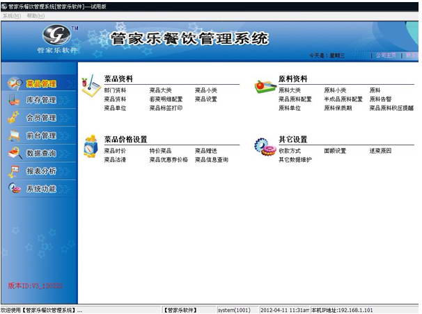 管家乐餐饮管理软件是一套综合性的餐饮管理系统,集预定、点菜、厨房分单、前台结算、客户管理、会员卡管理和后台的购、销、存、成本分析、经营分析等完备的一体化功能。支持触摸屏、PC机、PDA、点菜宝等多种点菜模式,可以处理预定、点菜、厨房传菜、前台打印、结帐打印、菜单维护、原料进销存、客户管理、菜品分析、成本分析、经营分析等餐饮管理业务,轻松完成从点菜、打印、结帐、采购、库存、核算的一条龙管理。采用了无线信息技术,更有力地促进了餐饮行业信息数字化管理。