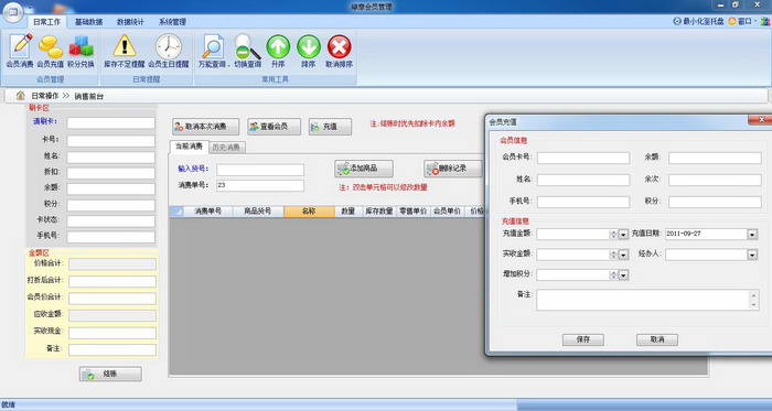绿意会员管理系统是一套通用性极强的会员消费管理软件,适用于会员中心、母婴用品店管理、烟酒店零售管理、其它商品库存管理等各行业需要实现会员消费、散客消费统一管理的单位。会员消费可自动积分、自动升级,让您的操作实现电脑自动化管理。简易的操作,朴实的界面,完善的会员管理功能,强大的查询统计报表,将使您的管理更方便、更实效,是全国同类软件中操作最易学易用的软件。