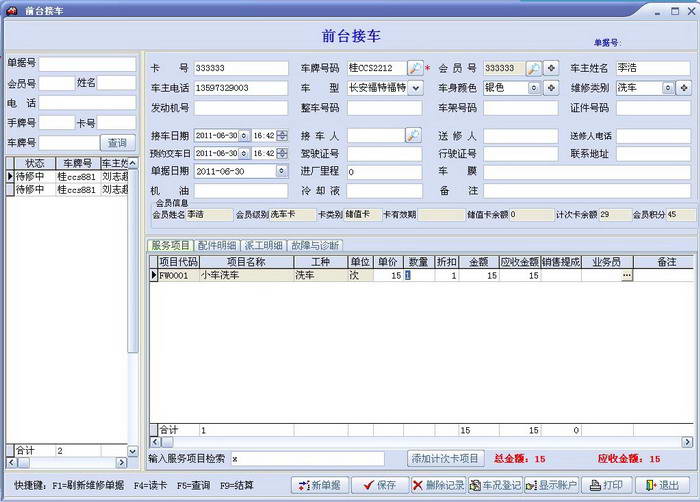 客户前来修车,首先是由修理厂有经验的接车员听顾客陈述故障现象。然后在前台接待的电脑进行基本情况登记和故障现象记录。与客户磋商,确定计划的修理项目和计划用料。在接车登记模块,接车员需录入客户和车辆的基本信息,如客户名称、车牌号、修理类别(大、中、小修等)、维修性质(维修、保险、三包、索赔),如客户已经来厂修理过,则客户信息和车辆信息可以从档案库中直接调取。业务员录入客户的修理定额后,在修理中如出现需要改变、调整修理计划的需要跟客户协商。有经验的接车员在录入车辆信息后,还可根据情况录入相应的故障、维修、用料信息,并打印对应的委托修理单,并由客户签名同意。如果有其它服务项目比如洗车、拖车、代办保险等费用可以在其它费用栏中输入,也可以在结算单输入这些费用。