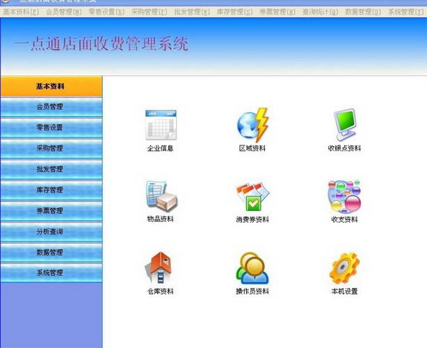 后台管理系统功能包括: 基本资料:包括商家企业信息资料、供应商资料、收银点资料(支持多收银点)、物品资料(所有商品资料都在这里建立)、消费券资料、仓库资料(支持多仓库)、操作员资料(操作员及其他角色人员及权限分配)、硬件设置(本系统所有硬件设备都是这里设置);