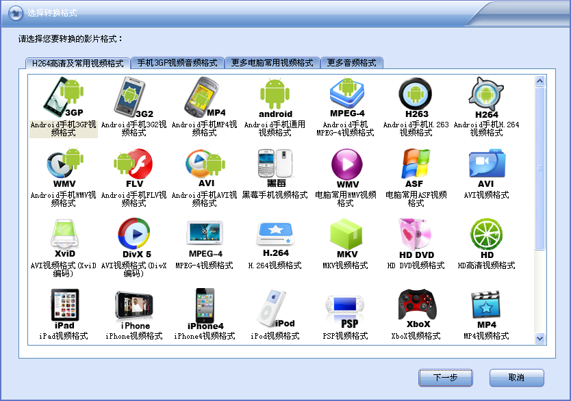 7.支持Android手机官方所支持标准视频格式3GP、3G2、MP4、MPEG-4、MP4-AVC (H.264)、H.263视频格式转换。