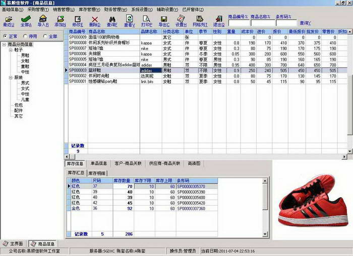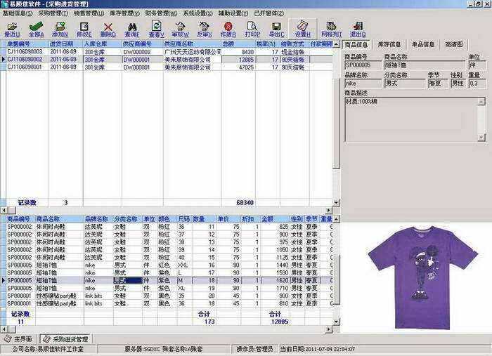 易顺佳服装仓库软件适用于中小型企业、工厂、公司、分销商、批发商、零售商、个体户、商店、网店服装行业进行服装/鞋子/帽子/箱包等商品的采购、销售、POS销售、入库、出库、库存、财务、对账等管理。主要功能包括商品信息、往来单位信息(包括供应商、客户、会员等信息)、采购申请、采购订单、采购进货、采购退货、采购换货、采购付款、销售报价、销售订单、销售出货、销售收款、销售退货、销售换货、商品入库、商品出库、商品调拨、商品盘点、收款单、付款单、预收冲应收、预付冲应付等,还包括大量的报表统计分析,通过这些管理,使公司的运转一目了然。只要您要进行服装/鞋子/ 帽子/箱包等这些商品采购、销售、库存、财务管理,这款软件就适合您。