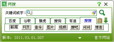 2、首次使用:用户解压好压缩文件以后,只需双击“Search”文件夹下的“网搜.exe”快捷方式即可打开该软件了。启动该软件后,网搜会自动隐藏到显示屏的上方,把鼠标移到显示屏的上方,即可看到网搜界面(与QQ操作相同)。