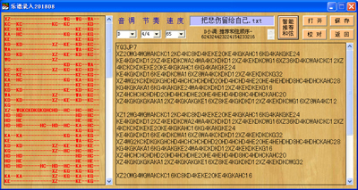 二:对乐谱录入新增录入校验和和弦推荐功能,进一步保障录入乐谱的正确性,使用方法是在乐谱录入窗口选好音乐的音调,节奏,速度等选项后,点击“校验”按钮,软件将会在录入窗口左侧以一个小节一行的方式对录入乐谱进行显示,绝大多数小节的字符将会以对称的显示方式呈现出来,如果字符很多都不对称,就说明录入的乐谱可能有错误的地方,修改后重新校验即可!同时软件可简单的对乐谱进行分析,为你推荐一个和弦顺序并记录,当然,如果不是你所希望的你也具有绝对的修改权限!