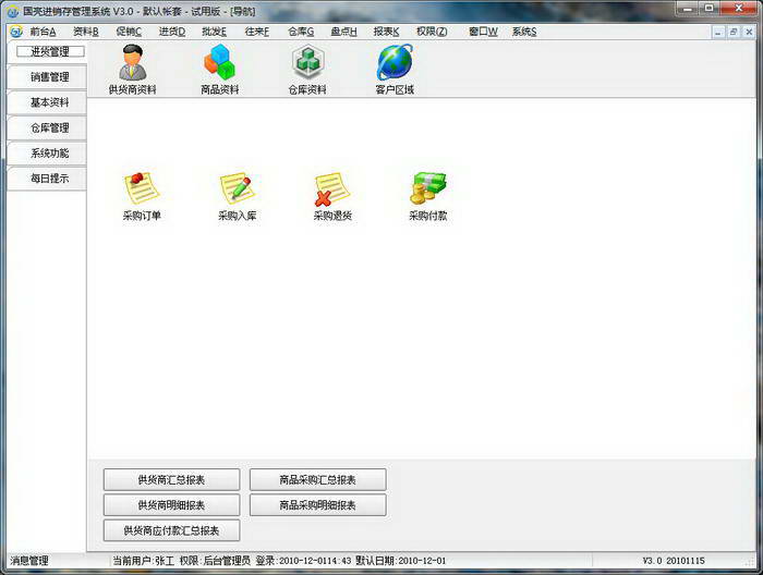 国亮进销存管理系统是广州国亮电子科技有限公司针对商品销售行业特点别推出的仓库流、资金流、信息流集成的一体化管理系统。能够在跨区域、多销售层次、商品销售企业中,对采购、库存、销售、收付款、零售点等各个业务环节进行管理,将商品销售链中的供应商、仓库、零售点、客户相关的业务都整合到一个平台。