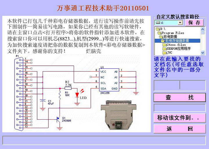一,虽然windows自带搜索功能,但有很多格式的文档无法打开(如彩电,DVD,单片机等的存储器数据读写操作,自己下载的绿色软件使用的文档以及其他windows不能自动识别的文档),而万事通却可以随意添加文档的打开方法。其次,各行业自己的专业软件使用更加快捷,如家电维修行业可下载集成电路查询,晶体管代换手册……机械行业可下载轴承型号查询,公差与配合查询等专业软件,放在常用搜索目录,需要时输入“晶体管”等字样即可快速打开软件,而你的桌面会十分整洁。三,修理彩电,DVD及单片机开发的朋友可下载24Cxx_RW等软件配合一个不到5元成本的简易接口电路即可进行彩电及单片机的数据读写,而这些文件的搜索与打开windows就无法胜任了。本版块需要注意的是无论是你自己写的经验文档还是网上下载的各种资料,都应该用较全面的文件名来命名,而在搜索时应使用较有特征的字符串,最好不要用符号,因为同一机型的写法(如29F9G-T就有可能是29F9G_T或29F9G(T)),因此使用29F9G进行搜索是明智的选择,同时建议你在特定的磁盘上(如D:)建一文件夹,然后把你的资料都放在这里,默认搜索路径也设在这里,将大大加快你的搜索速度。当然,在搜索速度上本软件也将进行适当改进,目前已新增了自定义搜索路径以加快搜索速度,如有更先进的搜索方法也一定进行改进。