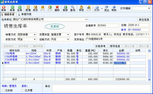 5. 完备的统计汇总,可随时根据日期区间、钢材名称、业务员、仓库名称、钢种、货品编码等字段查询及打印业务汇总表、业务明细表、及销售排行情况,让您多方位为钢材销售的经营决策提供切实可靠的数据服务。 6.安全可靠的数据管理:系统提供备份措施来保障您的数据安全存储,让您高枕无忧。