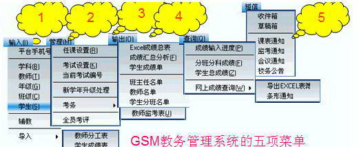 GSM教务管理系统可以将教务处电脑主机,教师手机、家长手机三者通过GSM短信收发模块联接起来,实现学生成绩传输及汇总分析管理、监考通迅管理、课表通知、会议通知等教务自动化——成绩管理: