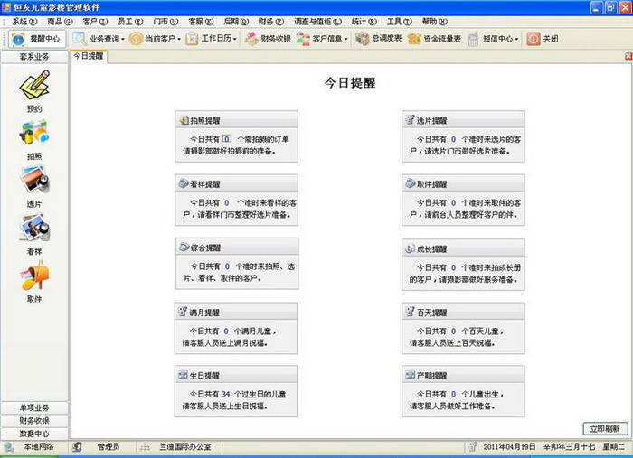 儿童影楼ERP是恒友公司推出的针对大、中型影楼使用的集合客户管理、流程控制、智能选片、后期调控、商品库存、员工业绩、客服管理、短信营销、财务监管、成本核算、经营分析等功能于一体的综合信息管理系统。功能强大、使用灵活,融入新一代的全局应用技术,不仅支持局域网多用户使用,同时支持互联网应用,支持异地多店面应用,可对多店面进行统一管理,支持移动办公。支持软件数据和影楼网站同步,用户可通过网站查询个人相关信息。