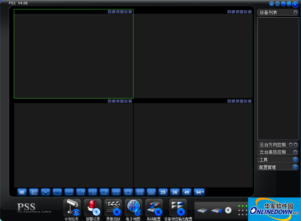 PSS是一款用于管理小批量安全防护监控设备的管理软件。PSS配对设备发布,不支持其他厂商设备的接入。PSS可以批量观看多个设备摄像头的实时监视视频。PSS可以批量观看多个设备摄像头的录像回放视频。PSS可以配置多种定时布防,实现全电脑值守。PSS可以配置电子地图,清晰描述各个设备所在位置。