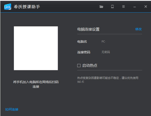 无Wifi时:打开电脑端,启动热点,将手机连接至此热点。打开手机App,同样选择需要连接的电脑点击连接或扫描二维码。