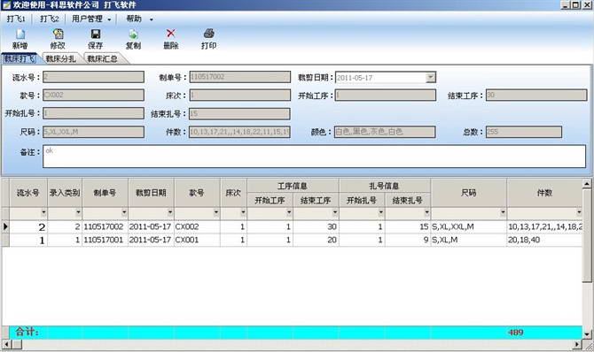 办公室文员:在电脑录入裁床制单,系统便会自动根据裁床的唛架比例与拉布层数,生成飞票的相关内容,例如制单号、工序号、扎号、件数、尺码、颜色等,并自动生成条码,然后快速地分扎打印带有条码的飞票。