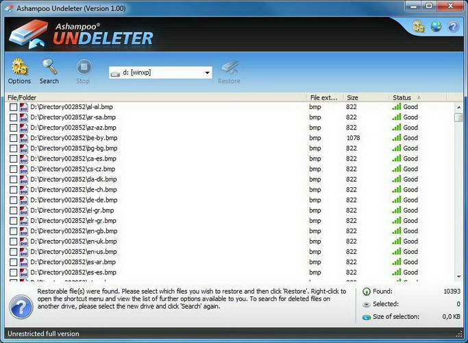 Ashampoo Undeleter 搜索结果除了列出已删除的文件外,还能看到已删除文件的状况。已删除的文件可能会处于不同的状况。显示的状态会让您了解已删除的文件是否能够完全恢复,或仅仅能部分恢复,甚至完全不能恢复。