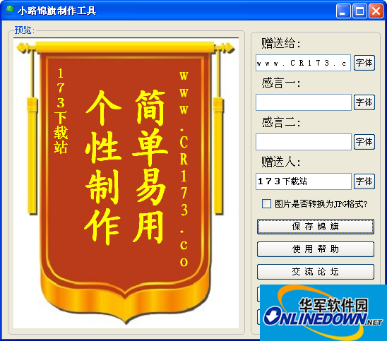 1楼 华军网友 2019-10-27 19:19:52小路个性锦旗制作工具很好用,谢谢啦!!