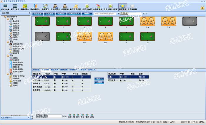 6、中间的红色辅助功能栏能够实时显示个各桌台的经营状况。例如:桌台费、商品费、器材费、陪打费、并单费、总费用、会员使用情况、会员卡余额、押金及预约情况、开台时间及耗时情况及组合的桌台号。