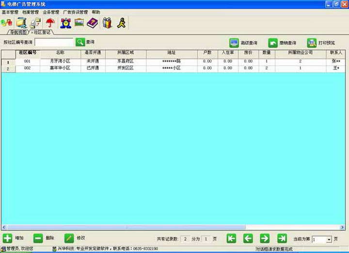 3、业务管理:功能模块包括社区合同登记、合同已到期社区、社区合同详细查询、社区合同提醒天数设置、客户合同登记、合同已到期客户、客户合同详细查询、客户合同提醒天数设置等。主要功能是对社区合同、客户合同进行管理。可进行登记、查询、根据自定义提醒天数进行合同到期提醒。