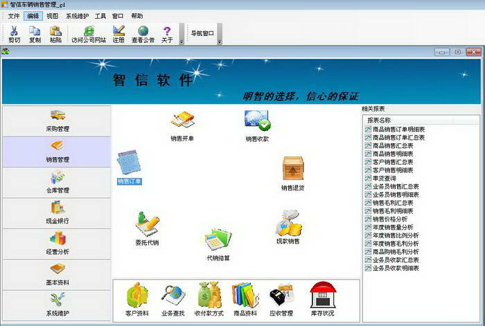 智信车辆销售管理系统主要分为车辆销售管理,仓库管理,财务管理,经营分析,基本资料,系统设置(权限管理)六大部分主要功能: