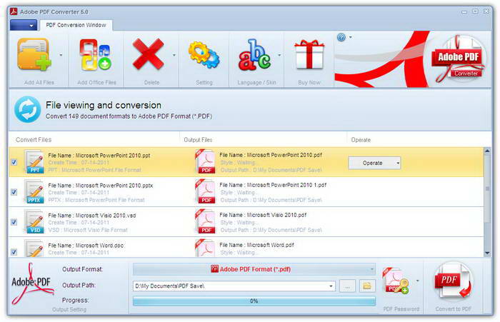 Adobe PDF转换器可以快速地转换来自140多个文件格式到PDF文件。包括 Microsoft Word (DOC, DOCX), Microsoft Excel (XLS, XLSX), Microsoft PowerPoint (PPT, PPTX), Microsoft Visio (VSD), Microsoft Works (WDB, WPS, DOCX, XLSX), AutoCAD (DWG, DXF, DWF), CorelDraw (CDR), Corel Presentations (SHW), WordPerfect (WP5, WP6, WPD, WPF), WordStar (WS), DocuWorks (XDW), QuattroPro (WB1, WB2, WQ1), Rich Text Format (RTF), Text Format (Txt), Hyper Text Markup Language (Htm, Html), Windows Bitmap (BMP), JPEG Compressed Image (JPG, JPEG, JP2)等文件格式到PDF格式。