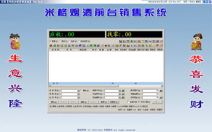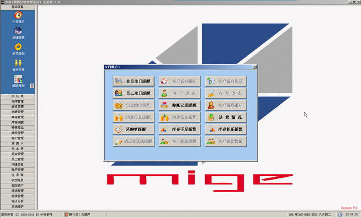 后台主要功能包括:基本信息(今日提示[会员生日提醒、员工生日提醒、消费日期跟踪、客户意向货品、客户维修、内部维修、定金约定消费、赊账记录提醒、客户消费跟踪、沟通信息提醒、沟通信息报警、进货情况、采购单提醒、库存不足报警、库存积压报警、供应商还款提醒、客户催款提醒、客户催款警报],店铺管理、奖罚规则、换岗交接、规格管理、类别管理、代码管理、定价管理、条形码打印)、供应商管理、采购管理(原始采购单、采购明细、采购已到未到明细、采购单提醒)、进货管理(单款入库、批量入库、进货单据、进销查询、退货管理、退货明细)、销售管理(收银记录、批发开单、批发单据、批发明细、批发退货、批发退货明细、销售记录、销售明细、销售明细查询、换货记录、退货记录、客户消费跟踪)、库存管理(库存商品、库存查询、库存备份、补货管理、盘点单据、自动盘点、货品跟踪、跟踪查询、促销商品、销售查询、商品统计、调价记录)、库存调拔(始发目的地设置、调入商品、到货管理、调出商品、提货管理、调入调出查询、库存调拔、库存合并)、特殊商品(赠品进货、赠品库存、赠送记录、积分兑换记录、赠品调入、赠品调出、特殊商品)、维修管理(客户维修、客户维修明细、内部维修、内部维修明细)、客户管理(客户管理、会员类别、会员登录、批量写卡、会员资料、消费查询、消费统计、消费分析)、消费卡(批量发消费卡、消费卡发放、消费卡充值、消费卡管理)、代金券(代金券发放、代金券管理)、定金管理(定金管理、定单明细)、员工管理(员工档案、出勤管理、员工业绩、奖罚明细、工资管理、工资查询、工资条)、沟通信息(沟通信息发送、我的沟通信息、沟通信息管理)、账户管理(账户管理、账户明细、存款管理、取款管理、账户转出、账户转入、转入转出查询)、往来账(应付款管理、已付管理、应收款管理、已收款管理)、收支账目(其它收入、费用管理、赊账管理、赊账明细、赊账还款明细)、固定资产(固定资产、计提折旧)、通信管理(FTP设置、下发数据、上传数据、导入数据)、短信管理(短信设置、短信管理、短信发送、发送日志)、统计分析(进货清单、进货退货、库存清单、库存明细、库存不足报警、库存积压报警、盘点清单、销售统计、销售明细、销量统计、销售统计分析、利润统计分析、销售换货、销售退货、商品销售排行、客流量统计、收银员销售统计、收银员销售统计图、各时段收银员销售对比、收银机销售统计图、各时段各收银机对比、导购员销售统计图、导购员销售明细、员工业绩排行榜、员工工资、费用清单、利润分析、银行账户、银行存款、银行取款、应收账款、收款明细、应付账款、付款明细、会员清单、会员消费排行榜、近期哪些会员生日、哪些会员需要充值)、系统维护(操作日志、数据清除、数据备份、数据恢复、班次设置、系统设置、小票说明、用户管理、更改密码)前台主要功能包括:零售、退货、批发、批发退货、导入总部数据、上传总部数据、各店之间调货、定金管理、补货管理、开钱箱及相关查询等。