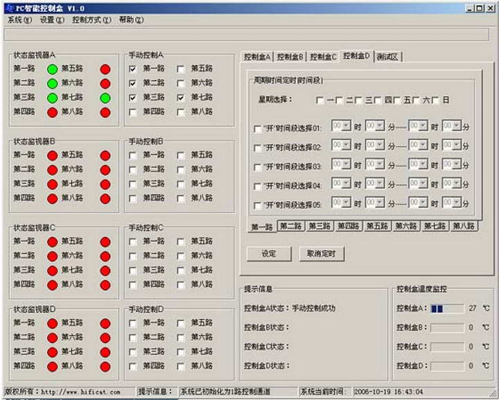 自动控制:用户输入时间值和星期,控制盒会按用户预设的星期和时间来进行判断,智能定时输出“开”或“关”的信号,控制相应的电器设备。8路电器设备全部可以进行定时独立控制,互不影响。