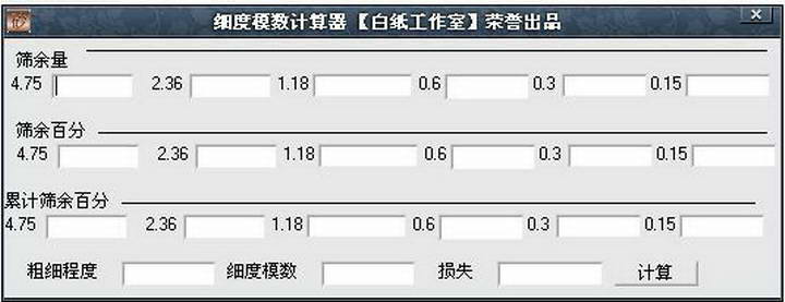 1楼 华军网友 2014-02-15 11:23:11砂子细度模数计算器界面设计很容易上手,功能很丰富,本人极力推荐!