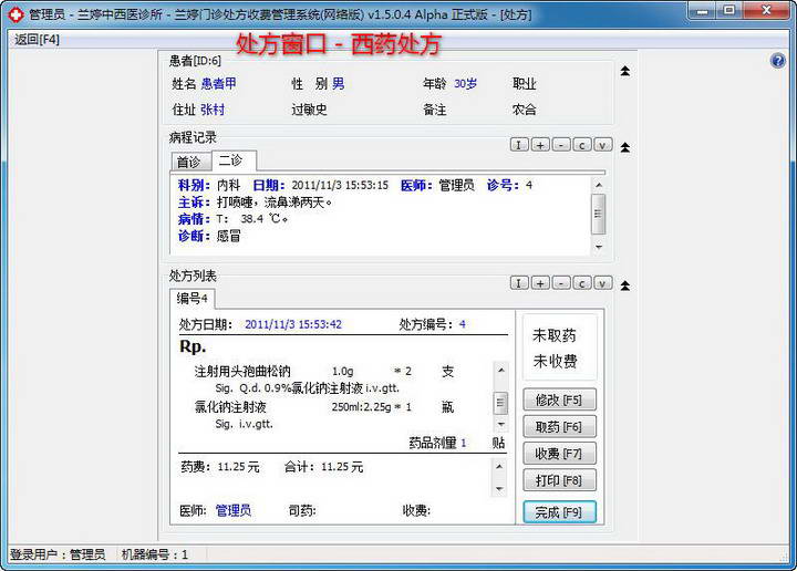 1、处方收费:收费时可(自动)抹零,可区分现金收费和刷卡收费;2、农合报销:农合报销金额可自动计算或手工输入,可打印农合报表、统计农合账目;3、欠账处方:只发药而不收费(或已收金额小于总金额)的处方,就是欠账的处方;4、欠账销售:可全额欠账或部分欠账,可日后再来还款,可生成欠账明细列表、统计等;5、欠账管理:支持处方的欠账销售,生成欠账明细和统计;6、支持钱箱:能控制钱箱,并记录现金收录明细、统计;7、现金管理:现金收支明细,统计报表;8、刷卡支付:支持刷卡与现金收费分开统计;9、处方统计:指定时间段内的处方列表、金额统计;10、利润统计:按时间段汇总、按执行人汇总、总计;五、【其它】