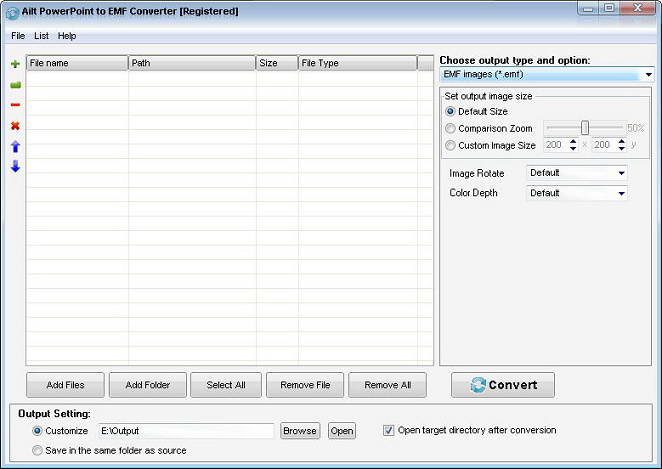 2楼 华军网友 2018-09-26 10:32:18Ailt PowerPoint to EMF Converter界面设计很容易上手,功能很丰富,本人极力推荐!
