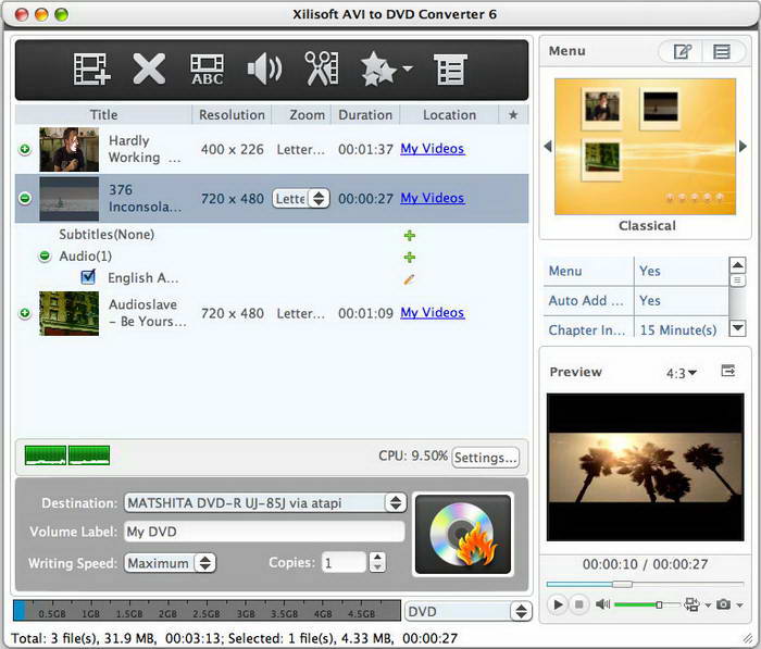 1楼 华军网友 2013-10-08 02:08:48Xilisoft AVI to DVD Converter For Mac很好用,谢谢啦!!