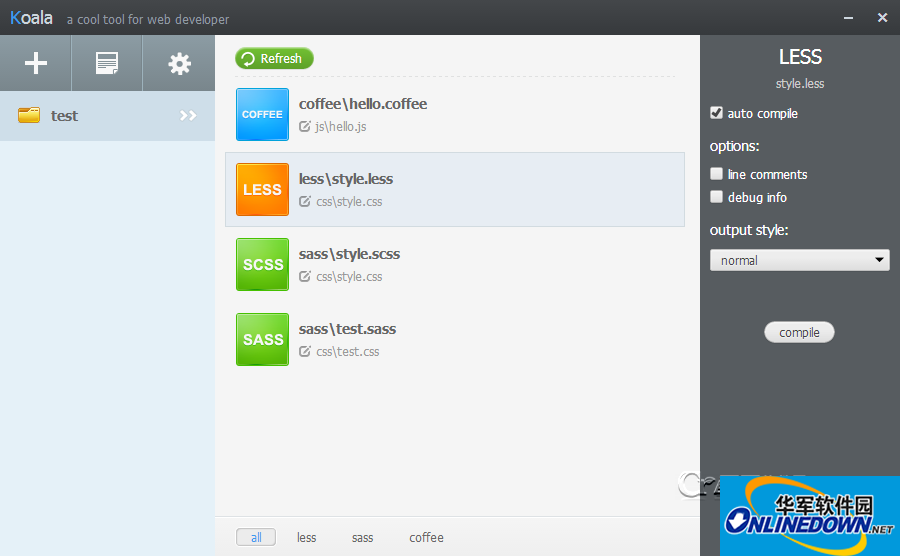 koala是一个前端预处理器语言图形编译工具,支持Less、Sass、Compass、CoffeeScript,帮助web开发者更高效地使用它们进行开发。跨平台运行,完美兼容windows、linux、mac。