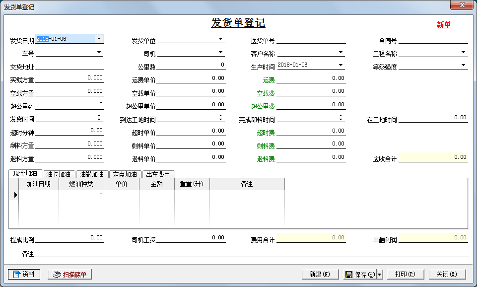 4、加油登记:车辆加油时进行登记。如果是出车时候的加油,可以在业务管理中的回车报账或简易登记的加油明细中登记,此处的加油登记的作用是除了出车加油外的加油。
