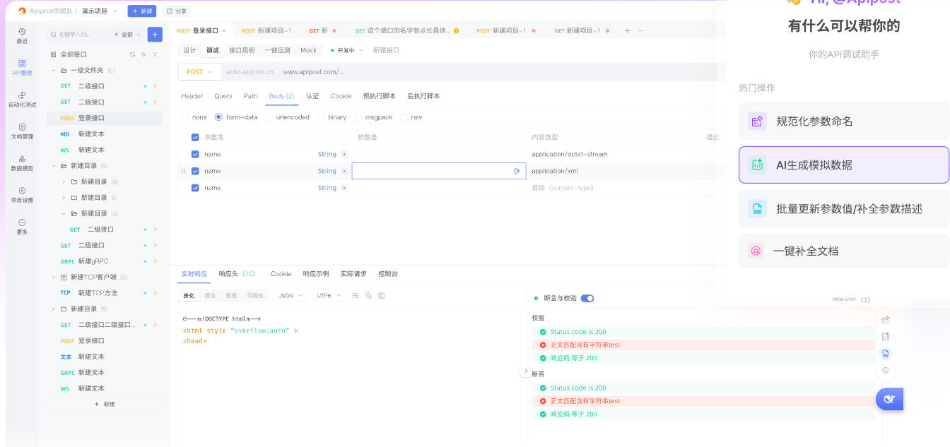 高效的 AI 智能开发助手:集成 AI 大模型,解决接口开发测试过程中命名难题、手动维护文档繁琐等痛点问题,实现 API 设计、调试、文档生成和自动化测试的闭环高效开发管理。