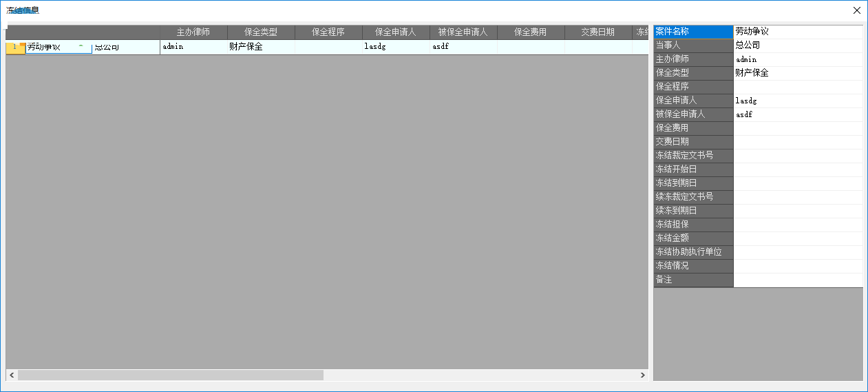 12、查封信息,可以显示当事人、主办律师、保全类型、保全程序、保全申请人、被保全申请人