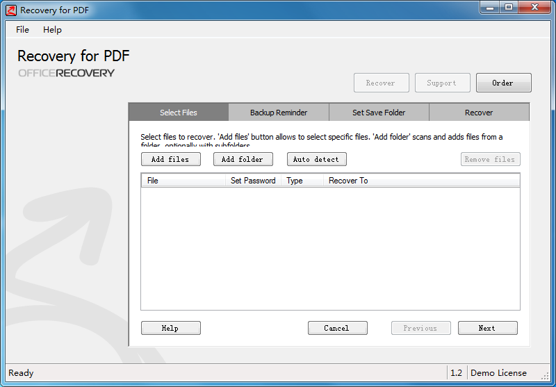 1、提供四个步骤执行恢复,第一个步骤选择PDF文件
