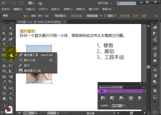 1、启动AI后Rasterino会在你的工具栏增加一个“Crop Image Tool(裁切图片工具)”工具。