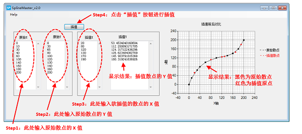 求解上述问题,使用本程序,在“原始x”一列中输入已知十组散点的x值,在“原始y”一列中输入已知十组散点的y值,在“插值x”一列中欲求取的散点的x值。输入完成后,点击“插值”按钮,欲求取的y值即显示在“插值y”一列中。