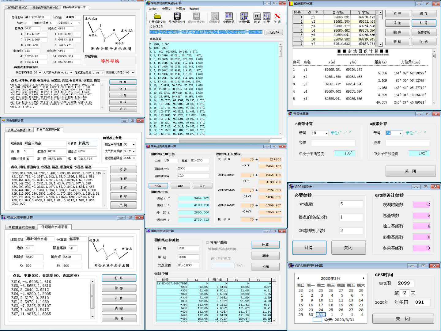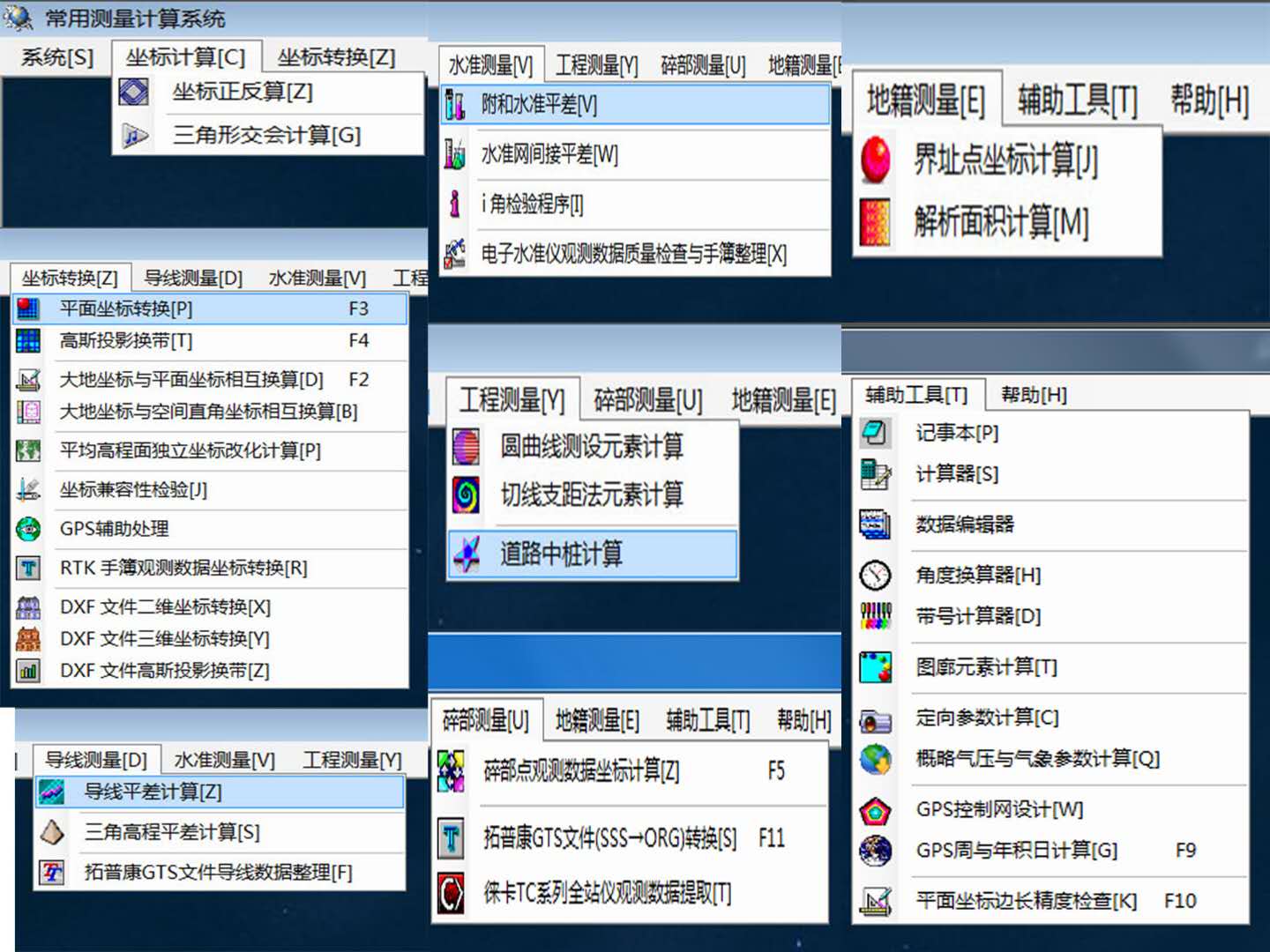 常用测量计算系统功能模块有【坐标计算】、【坐标转换】、【导线测量】、【水准测量】、【工程测量】、【碎部测量】、【地籍测量】、【辅助功能】等。