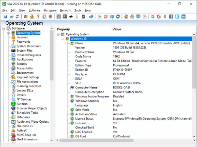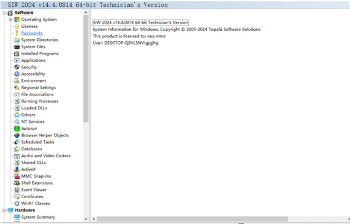 软件信息:显示操作系统版本、已安装程序列表、软件许可证、启动项、服务、驱动程序等,帮助用户管理系统资源。