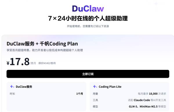 访问与订阅:通过百度智能云官方渠道进入 DuClaw 服务页面,完成账号注册(如未注册百度智能云账号)和服务订阅,首购用户可享受 17.8 元 / 月的优惠价格。