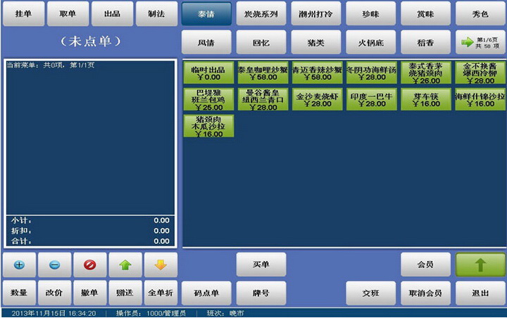 前台收银功能包括:预定(订台、订菜)、开台、点菜(支持烹调方式多选)、快餐点菜(打包、外卖)、加菜、即时新加菜品、退菜、赠菜、缓菜、上菜超时告警、催菜、结账、休息、转台、分台、合台结账、挂账、调回结账、老客户定期批量结账、打折结账、抹零结账及用多种支付方式同时结账等功能。可以查看每个楼层台位和包房的状态(空台、上人、每个台位或包房所容纳的人数、每个台位或包房有几个人在消费、一目了然)。