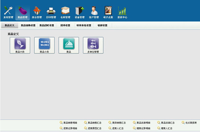 报表功能:收支报表(统计一天及任意时间段的收入情况)、菜品报表(统计任意时间段菜品销售情况)、员工报表(统计店内所有员工工作量情况)、原料报表(统计原料库存情况)、结账报表(统计开法票金额的数据)、销售报表(统计销售金额和挂账欠款金额)、会员报表(统计会员消费情况)、客户报表(统计大客户消费、结账、挂账情况)、顾客报表(统计顾客消费趋势及人钧消费情况)、调拨报表(统计店与店之间的原料调拨情况)、告警报表(统计因某种原因导致告警的次数)。