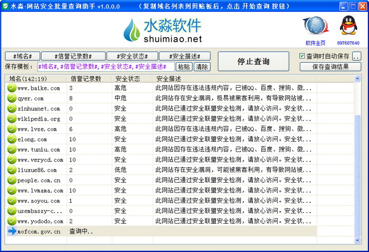 2楼 华军网友 2020-08-06 04:38:01水淼·网站安全批量查询助手软件非常好用,下载速度很快,很方便!