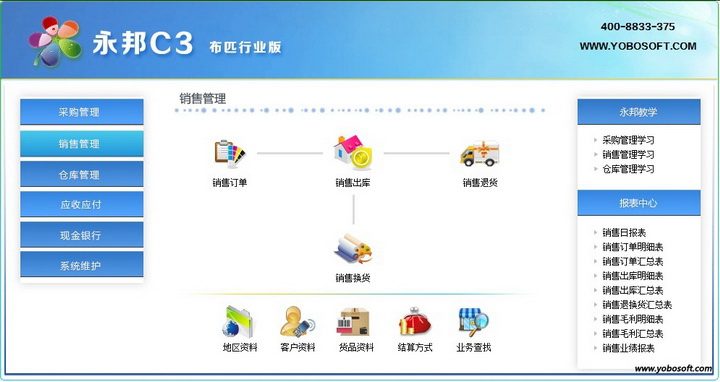 永邦C3布匹行业版是专门针对布匹行业企业开发的进销存、资金管理一体化软件,该软件为布匹经营企业提供了订货、销售、入库、出库、盘点、资金核算等信息化应用,全面提高工作效率,提升企业整体经营管理水平。
