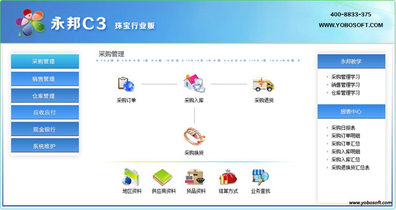 永邦C3珠宝行业版是专门为珠宝首饰珠宝企业量身定制的一套成熟管理系统。适用于以经营珠宝首饰类为主的工艺品企业,有批发、零售、直销等多种销售模式。