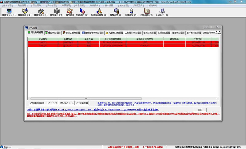 其次,新版本软件中对公司的业务管理方面也有不少的功能增加,如增加了车辆租赁管理模块,之前不少公司咨询到关于车辆租赁的问题,在8.0的新版本中我们 增加了这一功能。增加运营证和行驶证年审。重新规划了挂靠管理模块的内容,对于一些重要项目,以星号作标记为必填项目,其他一些信息用户可选择性填写,使 软件的操作更为简单明了。重新构建了车辆挂靠登记页面,增加了登记照片的类别,新增车辆照片、车主驾驶证等部分电子档案的管理。增加车辆安全教育模块,同 时该模块支持短信群发功能。安全责任重于泰山,对长途司机的安全教育更是不可小视,为此我们增加了这一功能,希望能让每一个在路上辛苦的司机都能平安出 行,随时把安全放在心里。增加车主生日到期提醒,在每位车主生日到来之际送上一份祝福,使之能切实感受到被关心和重视。新增加二手车信息需求的登记,主要 用于运输公司有车主需要买卖车辆的情况,记录买主的信息,方便车辆交易。在新版本中对照片管理更为细致,原版本中只有少量的图像管理,新版本中有驾驶员照 片 、车辆照片、身份证添加 、驾驶证添加 、资格证添加 、行车证添加 、运营证添加、 机动车登记证书等。同时,新版本的商险到期提醒、强险到期提 醒、年审到期提醒、代收费欠费提醒、二级维护到期提醒、借款还款提醒、按揭还款提醒、挂靠到期提醒、管理费欠款提醒,在这所有的提醒里面,如果过期的内容 要以红字特殊显示,更为醒目。另外,新版本软件中增加关闭系统提示自动备份数据库功能,随时备份数据,避免数据丢失造成困扰,让用户用得更安心。