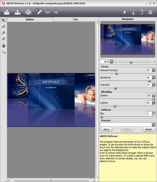 2楼 华军网友 2016-04-01 23:48:24AKVIS Refocus界面设计很容易上手,功能很丰富,本人极力推荐!