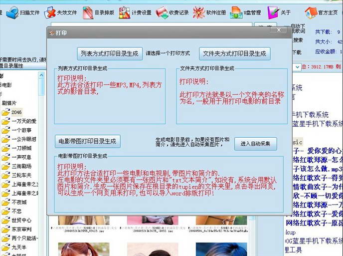 自动生成。列表方式打印目录生成,文件夹方式打印生成,电影,连续剧带图片简介生成,(没有图片简介的可以网上自动获取)非常实用!