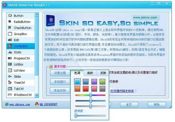 6.SKINSE界面库支持BMP、ICO、PNG、JPG等图片格式,支持皮肤色调变换,提供SKINSE内部的图像引擎接口。