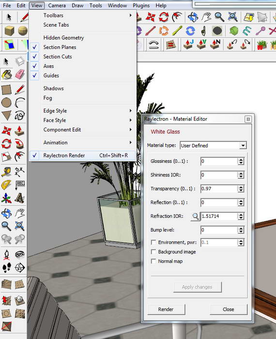 Raylectron V2 for SketchUp能够恣意配置任何材料的属性而能够发生不一样的成效,如镜面反射、折射(如玻璃)、通明度、光泽度、光泽度、凹凸贴图、法线贴图和背景图像。